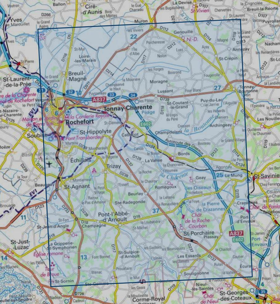 Communes couvertes : Châtelaillon-Plage, Fouras, Rochefort, Île-d'Aix, Yves, Marennes-Hiers-Brouage, Champagne, Saint-Jean-d'Angle, Ballon, Ciré-d'Aunis, Beaugeay, Moëze, Saint-Agnant, Soubise, Trizay, Saint-Froult, Échillais, Bourcefranc-le-Chapus, Saint-Hippolyte, Saint-Laurent-de-la-Prée, Port-des-Barques