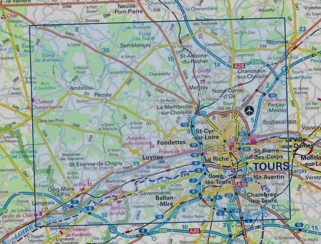 Communes couvertes : Tours, Langeais, Savonnières, Notre-Dame-d'Oé, Souvigné, Saint-Cyr-sur-Loire, Cerelles, La Chapelle-aux-Naux, Chambray-lès-Tours, Joué-lès-Tours, Cinq-Mars-la-Pile, Berthenay, Lar├ºay, Saint-Avertin, Saint-Genouph, Ballan-Miré, Villandry, Luynes, Chanceaux-sur-Choisille, Sainte-Radegonde.