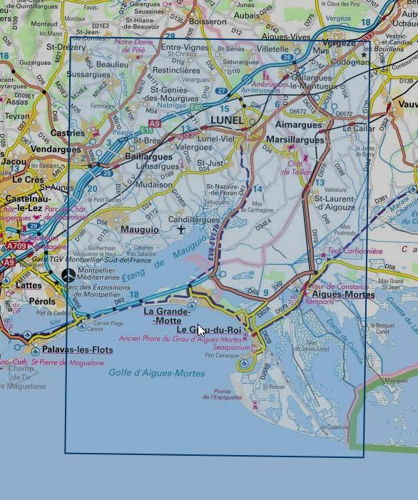 Communes couvertes : Aigues-Mortes, la Grande-Motte, Entre-Vignes, Castries, le Cailar, Saint-Laurent-d'Aigouze, Lansargues, Villetelle, Lunel, Saint-Just, Saint-Drézéry, Codognan, Baillargues, Saint-Sériès, Saturargues, Candillargues, Saint-Nazaire-de-Pézan, Aigues-Vives, Beaulieu, Gallargues-le-Mont