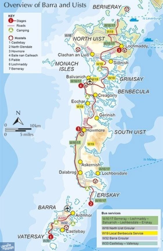 Starting at Vatersay, the routes crosses Barra, Eriskay, South Uist, Benbecula, Grimsay, North Uist, Berneray, Harris and Lewis to its current end in Stornoway.