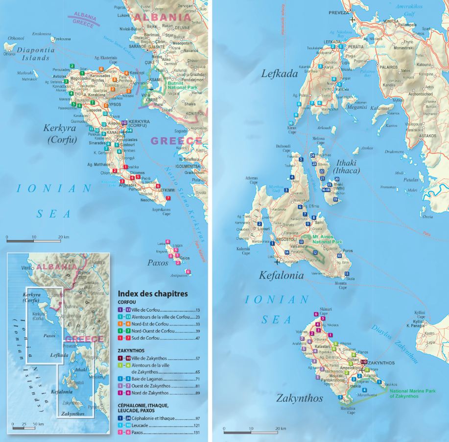 • carte de Corfou à l’échelle 1 : 110 000, de Zakynthos à 1 : 80 000, et Leucade, Céphalonie et Ithaque à 1 : 260 000.